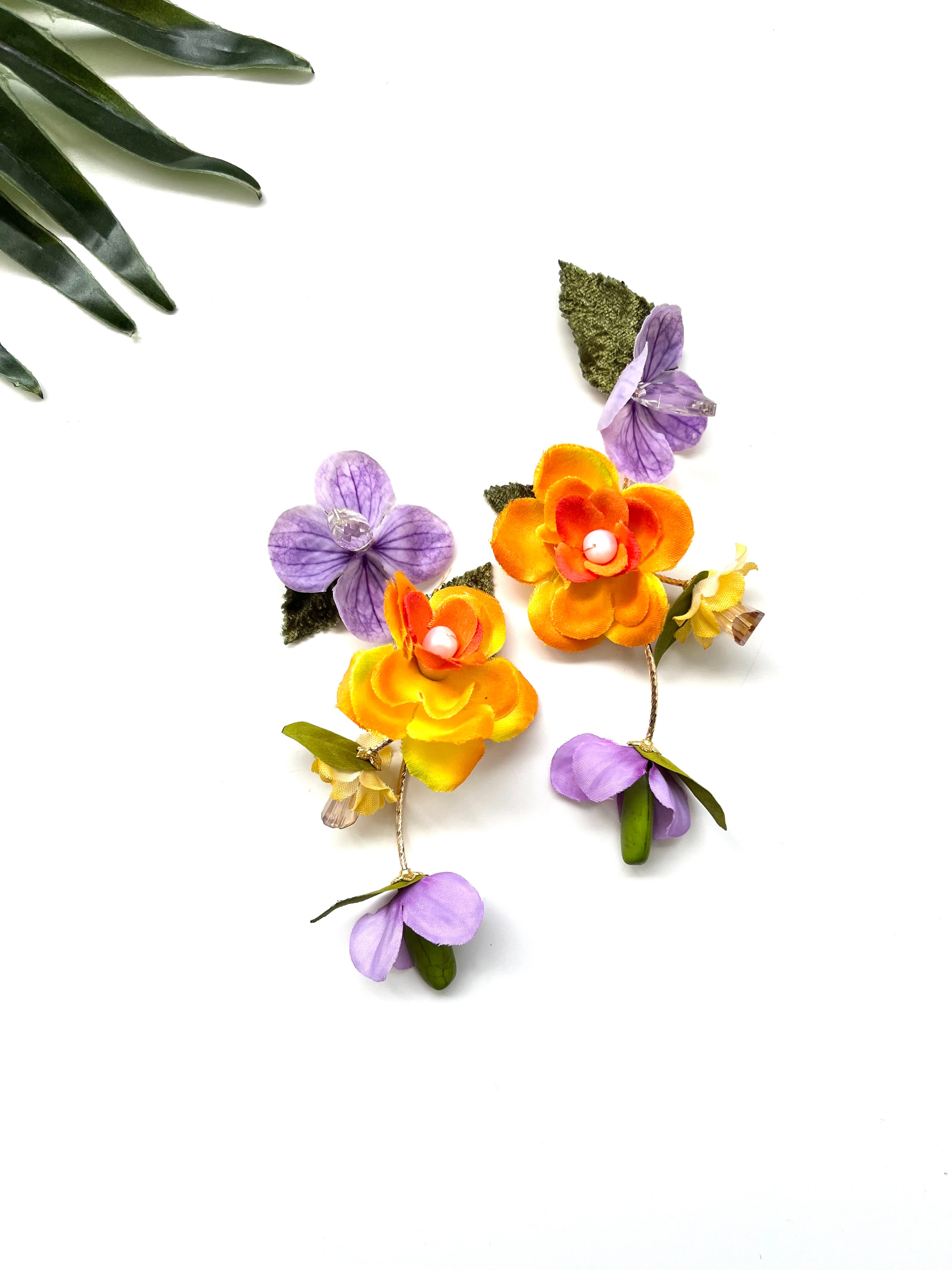 Want flowers dripping from your ears?  With the garden party cascades, that’s just what you’ll get!  These earrings are designed to capture some of the natural magic of a garden in full bloom for you to take with you.  Each pair is a unique and fanciful combination of velvet leaves, lush silk and fabric flowers, twinkling crystals, juicy freshwater pearls and beautiful stones wired and linked to create a vibrant floral cascade! The dainty cascade features all the magic of the original but scaled down.