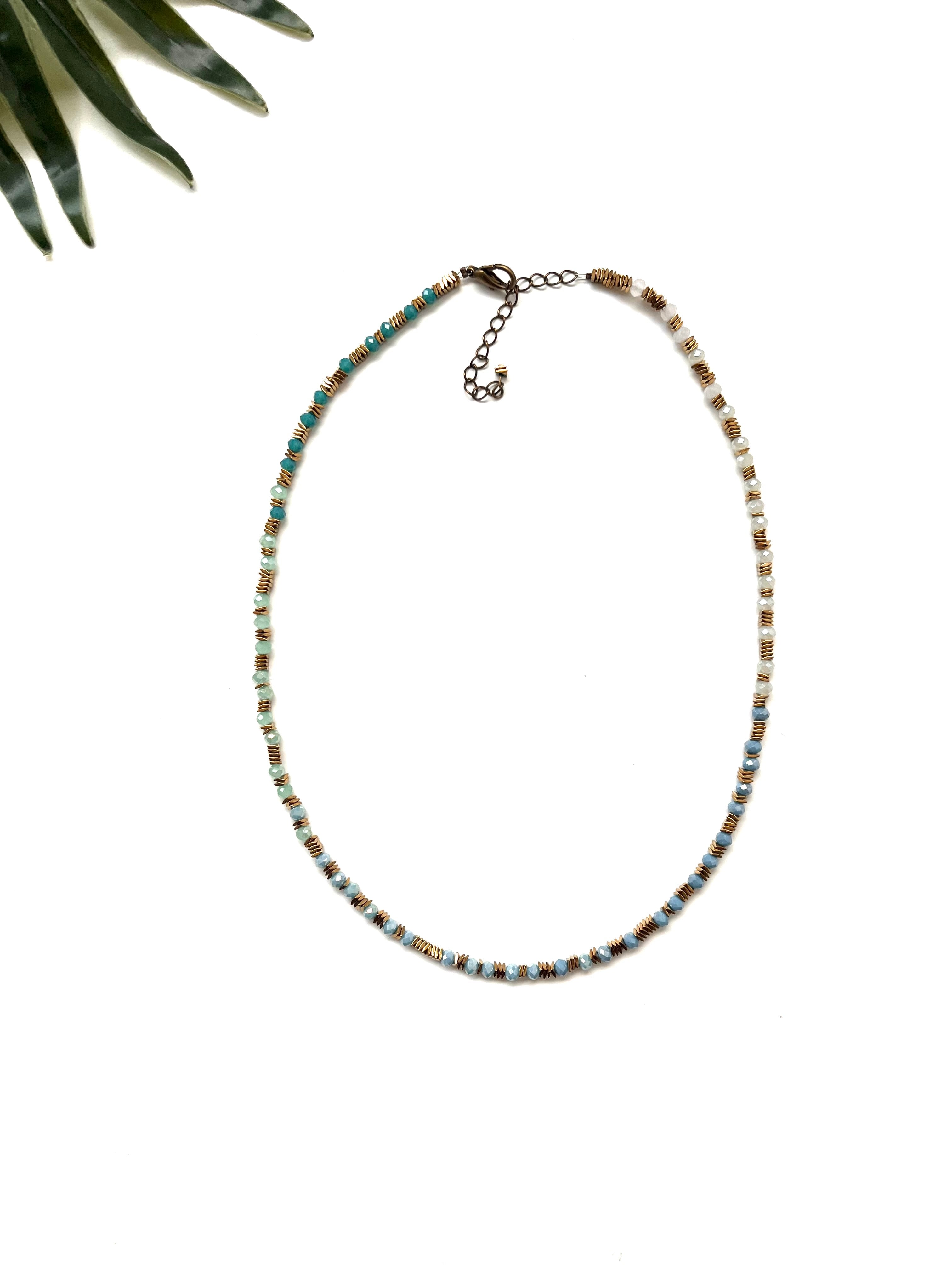 Just a little sparkle! This delicate necklace is great for layering or on it's own. It features electroplated hematite and a selection of tiny crystals and/or stones and antiqued brass coloured findings.