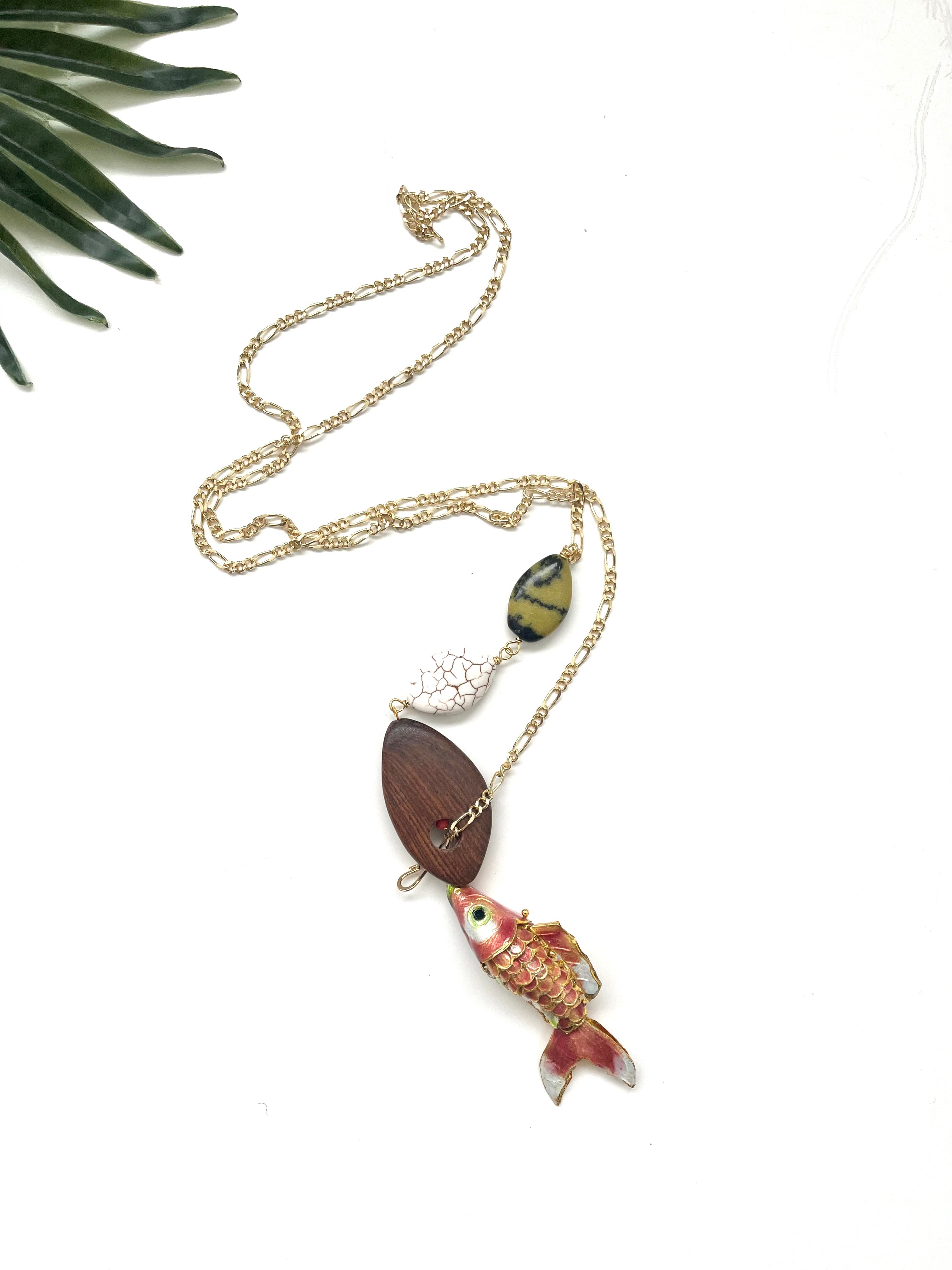 Are you ready to reel in a new necklace? The Hooked necklace is quirky in all the best ways.  It features an intricate articulated cloisonné fish dangling with a unique combination of wood beads and natural stones, all hooked to a sparkling gold-plated chain.
