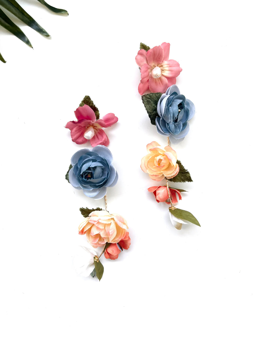 Want flowers dripping from your ears? With the garden party cascades, that’s just what you’ll get! These earrings are designed to capture some of the natural magic of a garden in full bloom for you to take with you. Each pair is a unique and fanciful combination of velvet leaves, lush silk and fabric flowers, twinkling crystals, juicy freshwater pearls and beautiful stones wired and linked to create a vibrant floral cascade! These shoulder dusting earrings are a whimsical and fun way to give your outfit a dazzling pop!
